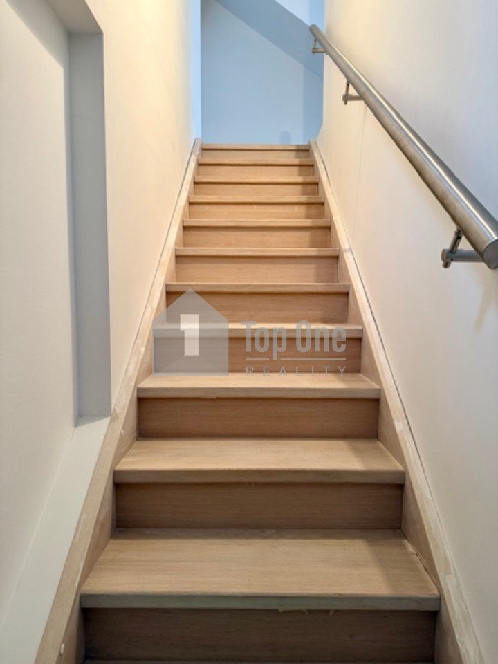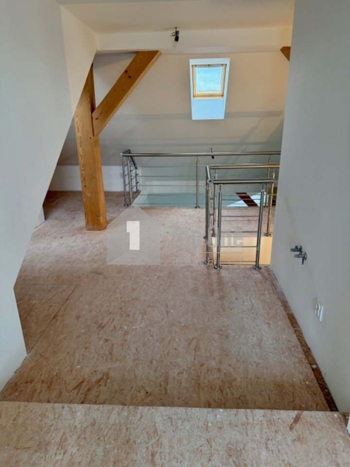 Byt v přízemí disponuje velkým obývacím pokojem s přípravou na kuchyňský kout, dvěma samostatnými neprůchozími pokoji, vstupní halou, kde je umístěn plynový kotel, samostatnou koupelnu (sprchový kout, vana), technickou místností a samostatným WC. Po dřevěných schodech se dostaneme do patra, které disponuje ochozem, větším pokojem, z kterého je vstup na prostornou, jihozápadně orientovanou terasu a společnou koupelnou s WC (vana). V prostoru bytu jsou přiznané dřevěné trámy.
