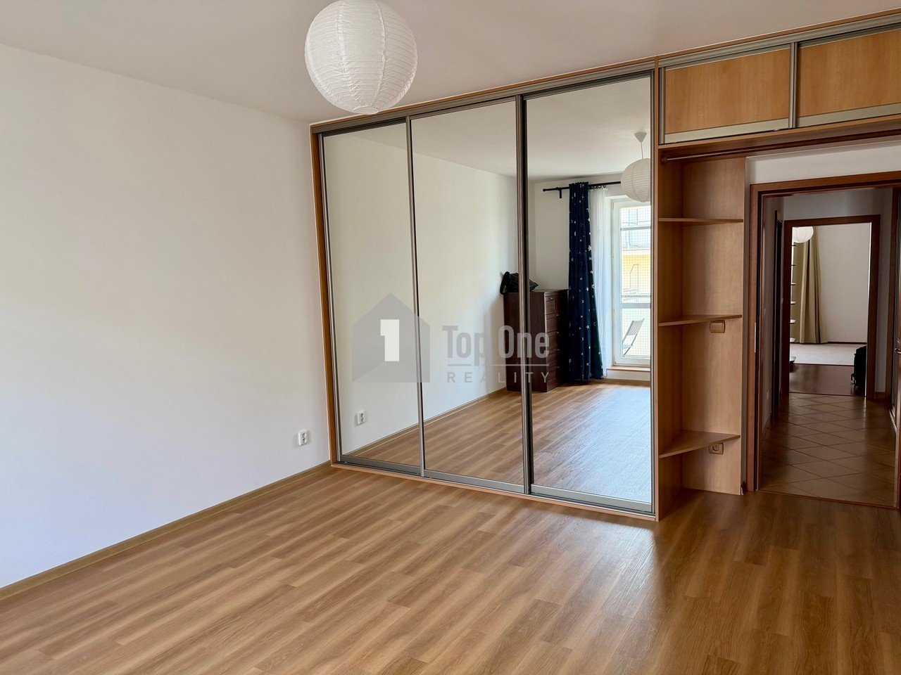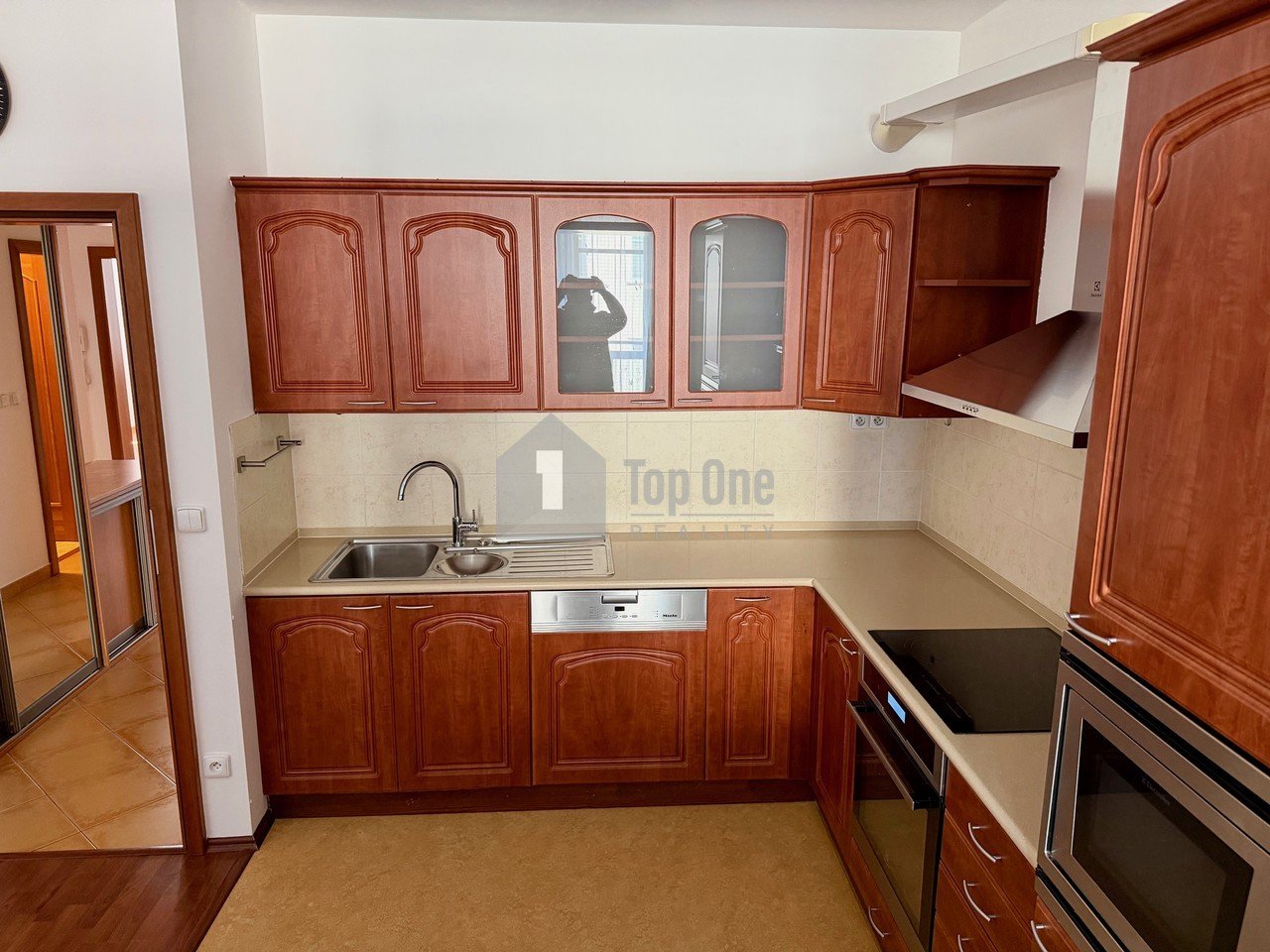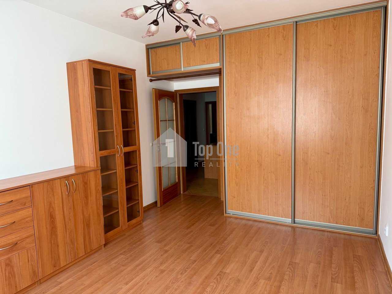 Byt disponuje prostornou předsíní (6,5 m2), která je vybavena vestavěnou skříní. Z předsíně je vstup do všech třech neprůchozích pokojů. Obývací pokoj je spojen s plně vybaveným kuchyňským koutem (25 m2). Z obývacího pokoje je vstup na jedenu z lodžií (6,3 m2). Dva další pokoje o výměře 20 m2 a 16,5 m2 jsou též vybaveny skříněmi na míru. Koupelna je vybavena vanou a je zde místo na pračku. WC je samostatně. Na druhý balkón (4 m2)je vstup z ložnice.